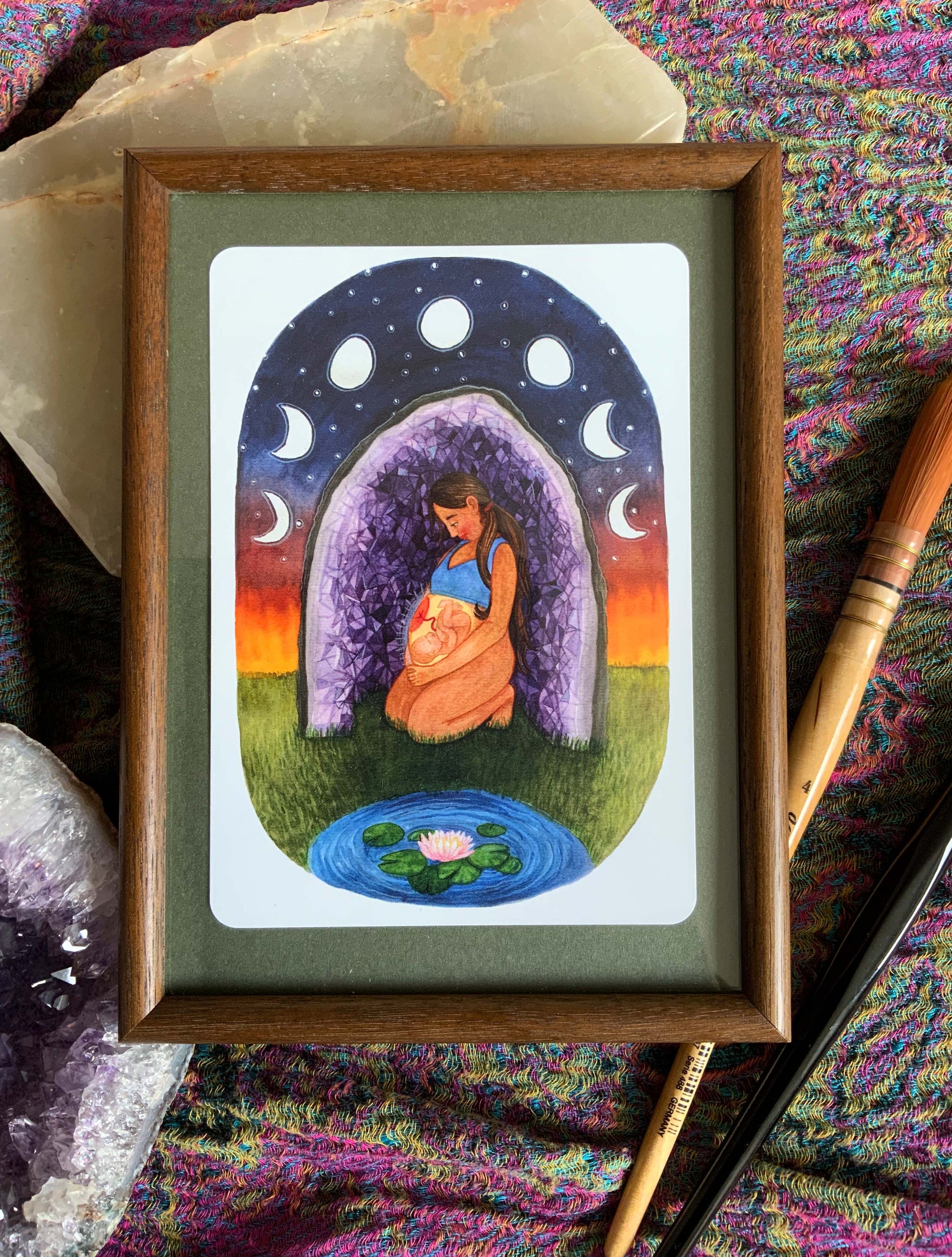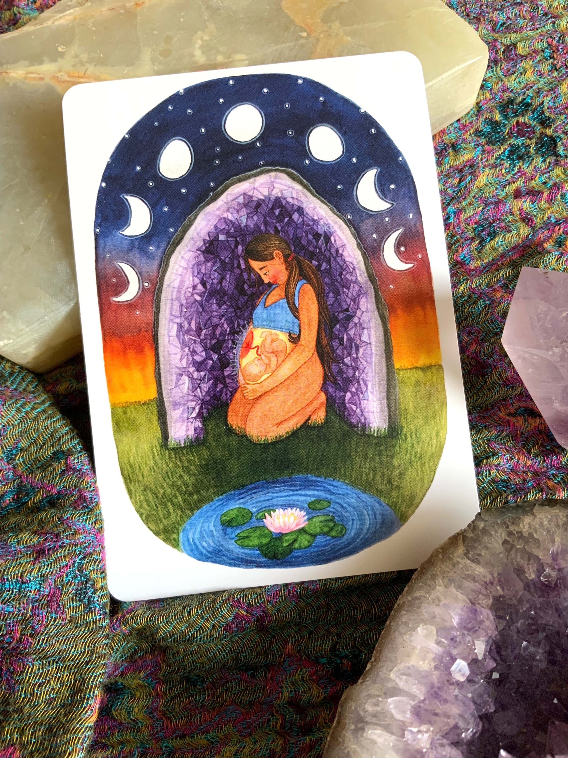 Eine Schwangere findet Schutz und Geborgenheit in einer Amethysten Druse und vertraut ganz auf ihre Intuition.