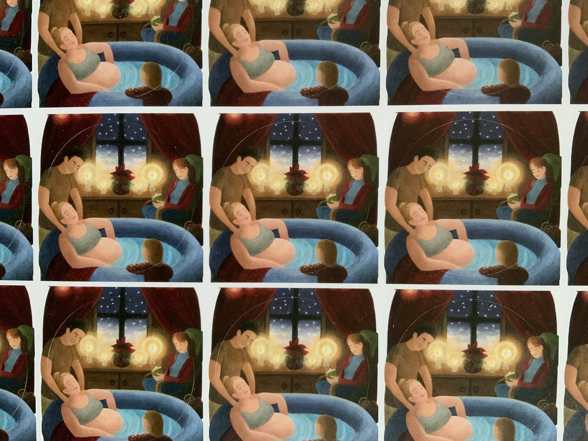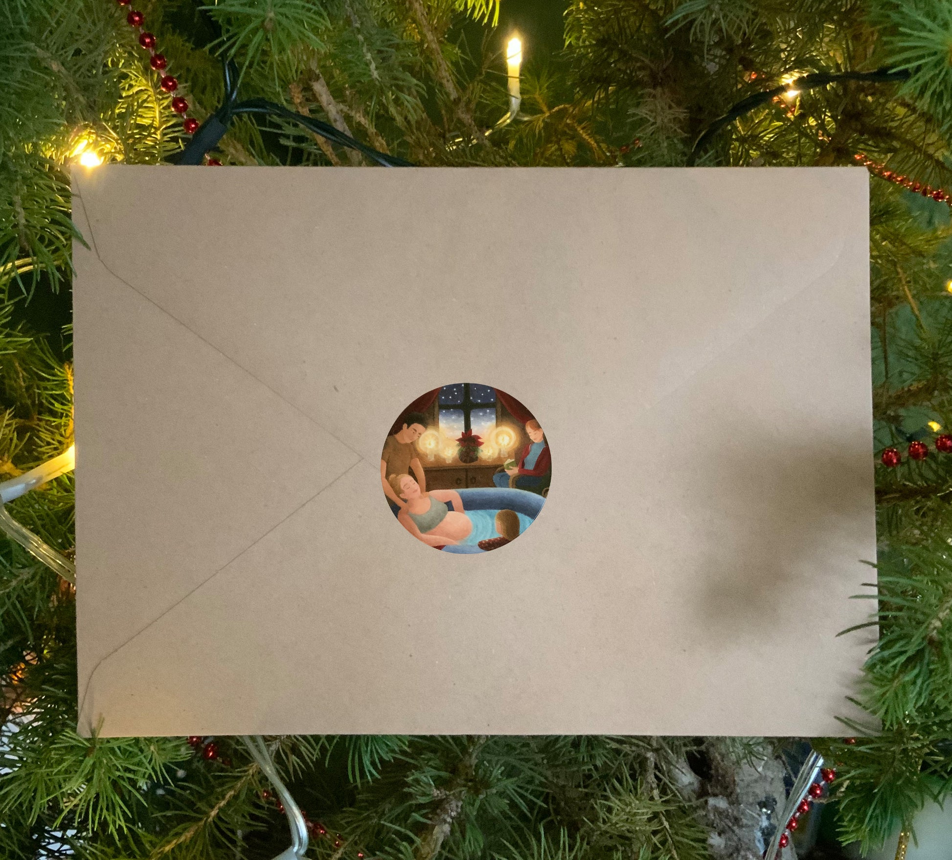 Dieser runde Aufkleber mit Aquarell-Illustration eignet sich wunderbar zur Dekoration von Geschenken für Schwangere oder für Mamas im Wochenbett :) "Vertrautheit" zeigt eine winterliche Hausgeburt im Geburtspool bei Kerzenschein.